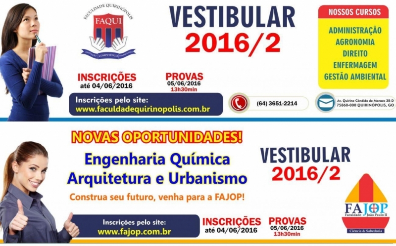 A FAQUI – Faculdade Quirinópolis – anuncia vestibular para o dia 5 de junho. São 5 cursos: Administração, Agronomia, Direito, Enfermagem e Gestão Ambiental. As inscrições estão sendo feitas pelo site www.faculdadequirinopolis.com.br. Outras informações através do telefone (64) 3651-2214. A FAJOP – Faculdade João Paulo II fará vestibular no mesmo dia, para os cursos de Arquitetura e Urbanismo e Engenharia Química. As inscrições estão sendo feitas através do www.fajop.com.br ou na secretaria da faculdade, à Rua José Joaquim Cabral nº 47 A.