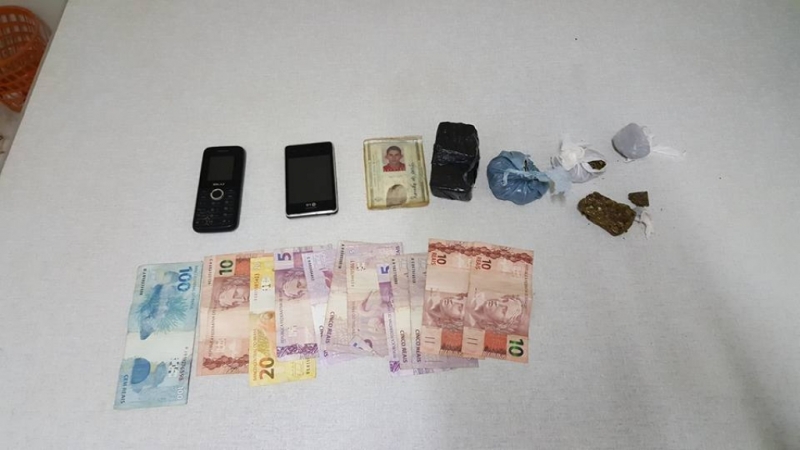 Também à tarde, a polícia patrulhava pelo Bairro Chico Junqueira, quando deparou com um rapaz de 20 anos de idade, o qual conduzia uma motoneta Traxx, em atitude suspeita. Os policiais fizeram o acompanhamento, abordando o elemento na Avenida Frei João Batista, próximo ao Colégio Dr. Onério. Nas vestes, ele levava uma porção de aproximadamente 20 gramas de maconha. O suspeito informou o nome do traficante que lhe vendeu a droga por R$ 50,00. Em seguida, os policiais se deslocaram até a casa do traficante, à Rua Jerônimo Vicente Ferreira, onde foram apreendidas duas porções de maconha, que estavam na janela e 150 gramas da droga, que estavam escondidos em uma sapateira. Foram apreendidos também R$ 195,00 em dinheiro, 2 celulares e o veículo usado pelo suspeito.