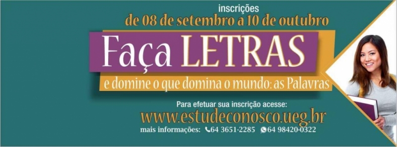 Venha para Letras! Garanta-se no mercado de trabalho e domine o que domina o mundo: as palavras!! Inscrições abertas no site da UEG de 12 de setembro a 10 de outubro. Os primeiros 20 inscritos ganharão uma camiseta e uma linda bolsas do curso de Letras.