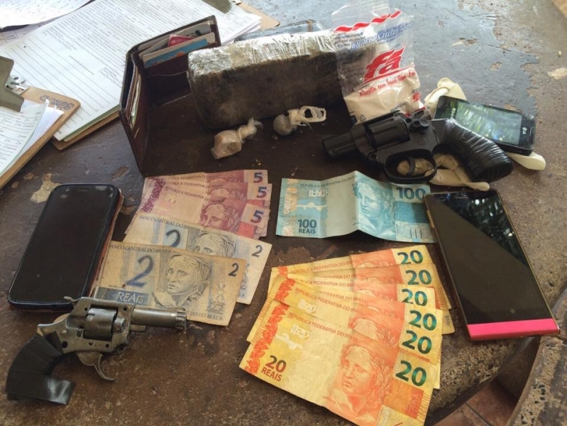 Os policiais foram até o local, após receberem denúncias anônimas de que a casa era utilizada como boca de fumo. Os denunciantes informaram também que o morador e alguns freqüentadores estavam envolvidos no roubo praticado na madrugada de ontem (14), no estabelecimento ?Água na boca?, na Avenida Brasil. Quando a viatura chegava para averiguar as denúncias, os suspeitos tentaram fugir, mas acabaram detidos. Na cintura de um dos rapazes foi encontrado um revólver calibre 22, de fabricação argentina. A arma estava com 5 munições intactas. O elemento confessou que o roubo na lanchonete foi praticado por ele e por outros dois rapazes.