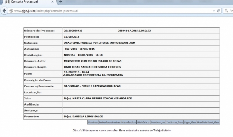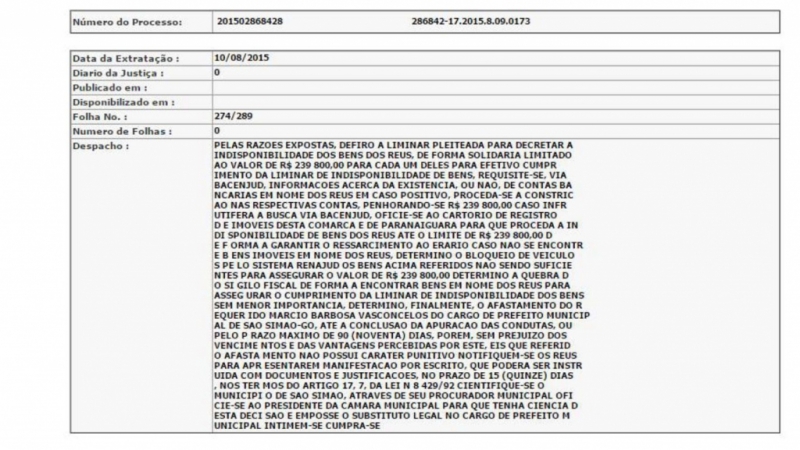 SUELI BORGES DE FREITAS nos autos nº: 201502868428, pela meritíssima juíza de direito foi concedida a medida liminar requerida pela parte autora (mp), tendo decretado “o afastamento do requerido, Dr. Marcio Barbosa Vasconcelos do cargo de prefeito municipal de São Simão-go, até a conclusão da apuração das condutas, ou pelo prazo máximo de 90 (noventa) dias, porém, sem prejuízo dos