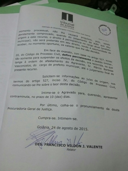 Após quase duas semanas prefeito de São Simão recorria a liminar que determinava o afastamento por possível improbidade no dia 24/08 foi deferida parcialmente pelo desembargador Francisco Vildon José Valente e prefeito Márcio Barbosa Vasconcelos volta ao cargo de prefeito de São Simão-GO.