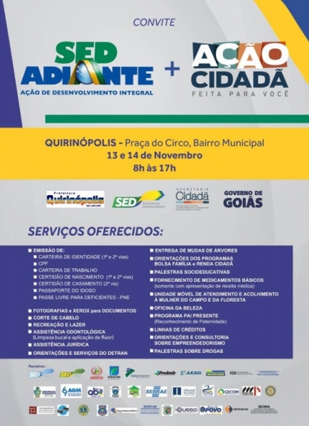 Quirinópolis irá receber nos dias 13 e 14 de novembro, o programa Ação Cidadã do Governo de Goiás. Na oportunidade a população terá acesso gratuito a diversos serviços, como emissão de CPF, Carteira de Identidade, Carteira de Trabalho, Certidão de Nascimento, Certidão de Casamento e Passaporte do Idoso, corte de cabelo, atendimento do Banco do Povo e do Renda Cidadã, palestras sobre empreendedorismo, recreação para crianças e adolescentes, entrega de remédios, orientação jurídica e abertura de processo pela Defensoria Pública, atendimento odontológico, atendimento da Unidade Móvel da Mulher do Campo e da Floresta, doação de enxovais para recém-nascidos em situação de vulnerabilidade social, doação de muletas e andadores para cidadãos em situação de vulnerabilidade social, e programa Pai Presente, com reconhecimento de paternidade.