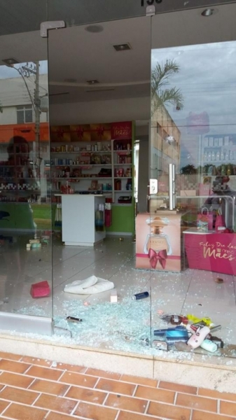 De volta à Avenida Brasil, a polícia deparou com o vidro da porta de O Boticário, quebrado. Vários perfumes ficaram espalhados pelo chão. No momento da confecção da ocorrência, a proprietária da loja não foi localizada, por isso não foi possível precisar se algo fora levado pelos ladrões.