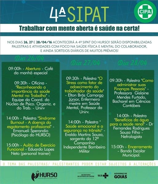 A 4ª edição da Semana Interna de Prevenção de Acidentes de Trabalho (SIPAT) do Hospital de Urgências da Região Sudoeste (Hurso), em Santa Helena de Goiás (GO), teve início nesta terça-feira (26/04). O evento terá duração de três dias com atividades variadas para todos os colaboradores do Hospital, e é coordenado pela Comissão Interna de Prevenção de Acidentes (CIPA), em parceria com o Serviço Especializado em Engenharia de Segurança e Medicina do Trabalho (SESMT).
