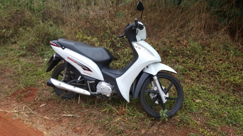 O veículo que havia sido furtado no sábado. Trata-se de uma moto Honda BIZ, cor branca, ano 2015, placa ONE-3222 de propriedade da Vereadora Yvislaine.