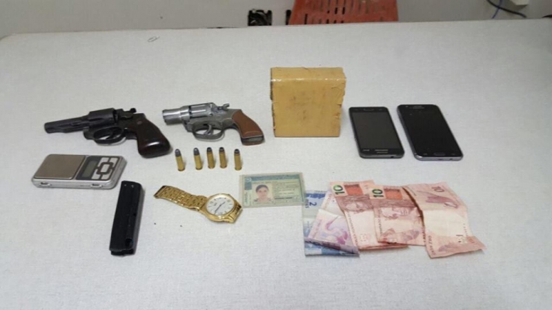 Neste outro local, os policiais encontraram uma porção de maconha (424 gramas), uma balança de precisão, um simulacro de arma de fogo, dinheiro e um relógio. Os envolvidos foram levados para delegacia.