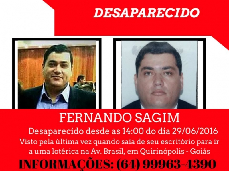 Na tarde de ontem (29) o Dr. Fernando Sagim, foi a uma Casa lotérica na Av. Brasil, e desde então encontra-se desaparecido. Os familiares já procuraram as autoridades policiais para comunicar o desaparecimento, contudo neste momento é preciso da colaboração de todos, por noticias acerca de seu paradeiro. Assim pedimos a todos que tiverem qualquer informação favor entrar em contato através do 190.