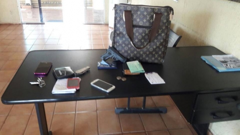 Com os suspeitos de 28 anos de idade foram encontradas duas carteiras, nas quais estavam documentos e cartões roubados da vítima. No carro foi encontrada uma bolsa feminina com documentos, R$ 19,00 em dinheiro e um celular também roubado. Um simulacro de arma de fogo e vários documentos estavam espalhados no interior do veículo e foram apreendidos. A dupla foi levada para delegacia.