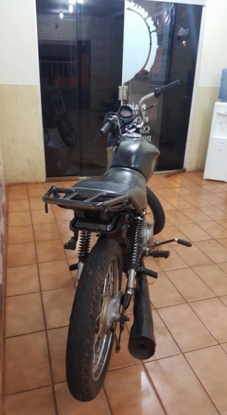 Em novos patrulhamentos, a polícia deparou com um veículo suspeito, próximo ao Clube Eldorado. Ao avistarem a viatura, os dois elementos fugiram em alta velocidade, pela contramão. A viatura acionou a sirene e o giroflex, perseguindo os suspeitos. Em determinado momento, a dupla efetuou disparos em direção à viatura. Os policiais revidaram, disparando contra os suspeitos, que continuaram em fuga. Alguns quarteirões adiante, próximo à rotatória da Avenida Santos Dumont esquina com a Rua Frederico Armando da Silva, o condutor da moto saltou do veículo e entrou em um lote baldio, às margens do Córrego Cruzeiro. Um menor de 16 anos foi encontrado e apreendido em meio a um matagal. O menor informou que o veículo havia sido furtado em uma padaria da Avenida Rui Barbosa esquina com a Avenida Santos Dumont. O veículo teve a cor adulterada de vermelha para preta. A numeração do chassi e do motor foi raspada. O infrator foi levado para delegacia, junto com o veículo.