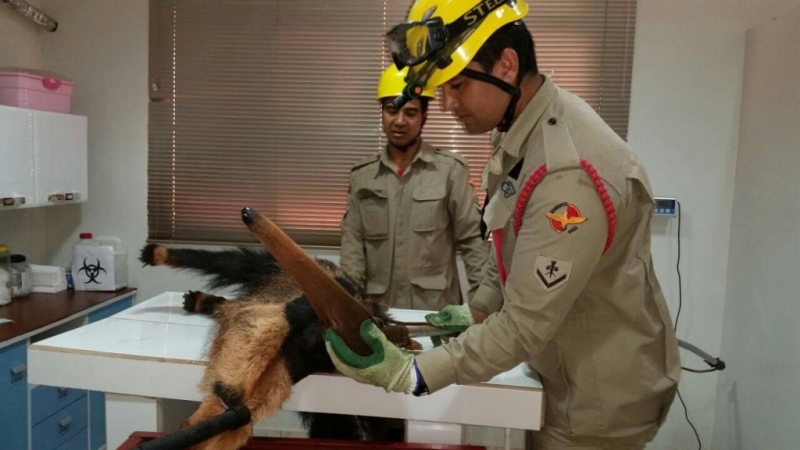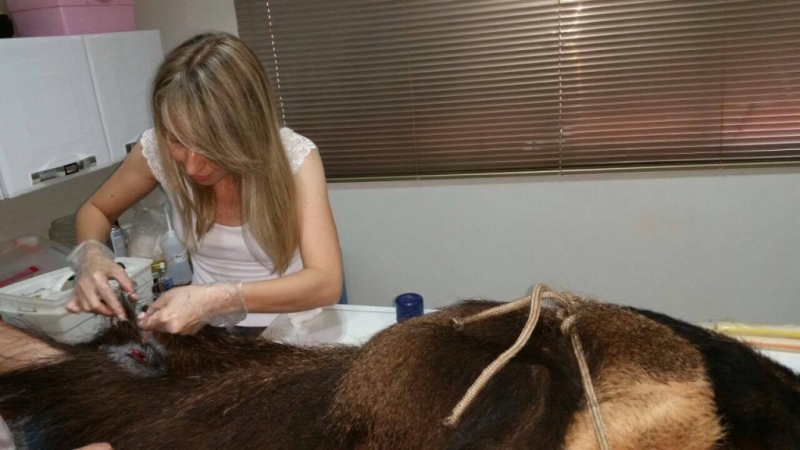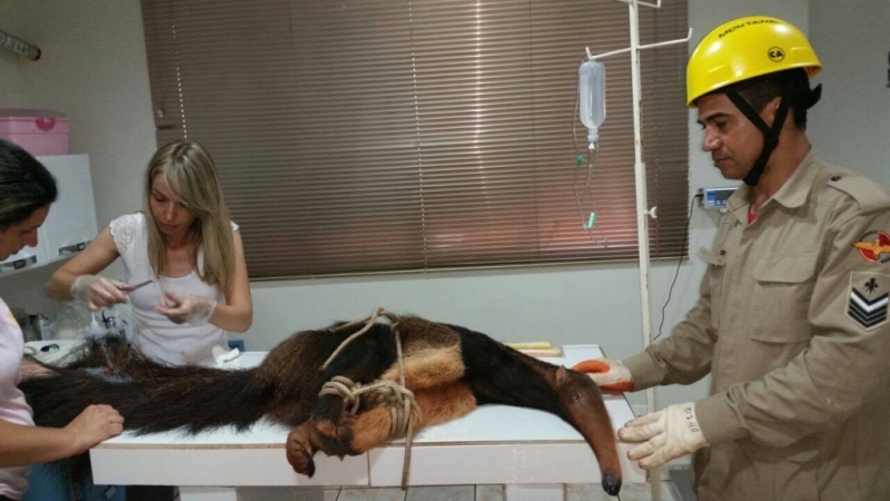 Por volta das 13 horas de hoje, o CBMGO de Quirinópolis foi informado via 193, que havia um Tamanduá Bandeira na rua 2 do Tonico Bento. Ao chegar no local os bombeiros perceberam que o animal estava ferido e bem debilitado. Sem ter para onde levar, solicitaram ajuda da Dr. Liliam da clínica veterinária Bichos e Caprichos, de imediato a veterinária atendeu a solicitação dos militares e atendeu, medicou e internou o animal de forma voluntária.