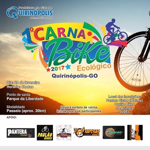 Marcado para o dia 28 de fevereiro, o 1º CarnaBike, de Quirinópolis. A saída será às 8h da manhã, do Parque Liberdade. O passeio terá um percurso de aproximadamente 30km. Haverá sorteio de brindes entre os participantes.