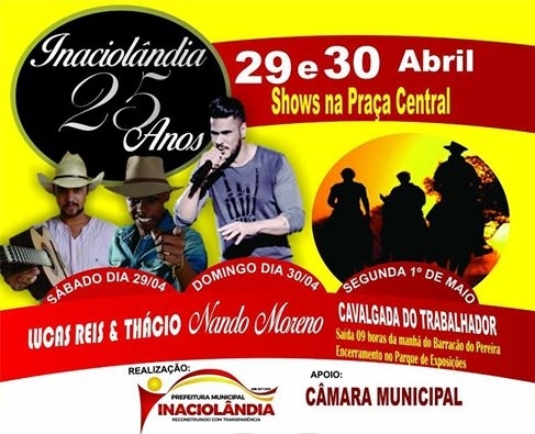 O prefeito Chiquinho disse que, mesmo com as dificuldades enfrentadas no início da gestão, é preciso fazer algo para marcar os 25 anos de emancipação político-administrativa de Inaciolândia. “Estamos organizando um evento com poucos recursos, mas de qualidade”, destacou o prefeito. A festa conta com o apoio da Câmara Municipal.