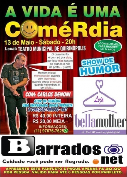 No dia (13) de Maio - Sábado, o Teatro Municipal Sodino Vieira de Carvalho traz mais um espetáculo para a população Quirinópolina. Com a direção e coordenação da Superintendência da Cultura, a comédia (A VIDA É UMA COMÉRDIA) promete arrancar gargalhadas do público que comparecer ao Teatro.