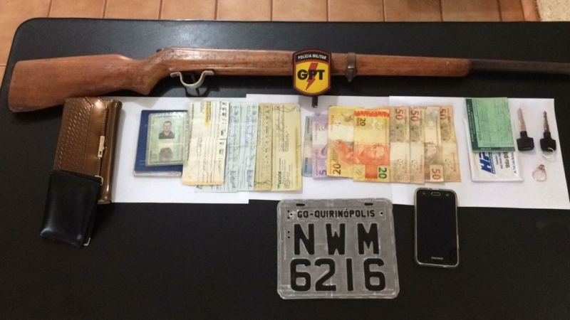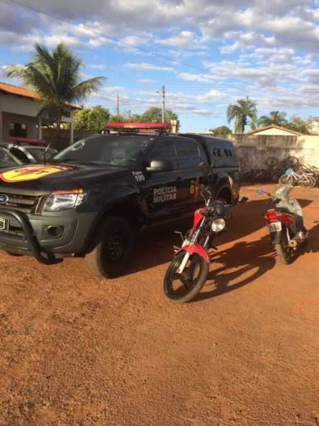Em continuidade às diligências acerca de uma motocicleta Honda Biz vermelha, roubada na noite de ontem (6), a equipe do GPT, composta pelos Sargentos Ademar e Sinésio e Cabo Leandro, recebeu informações sobre os supostos autores, os quais estariam oferecendo a mesma pelo valor de R$ 1.000,00. Os militares patrulharam pela cidade, localizando um dos suspeitos do crime. Na casa dele foi encontrado o veículo roubado, seu documento, valores em espécie, telefone celular, além de uma arma de fogo (espingarda) e uma bolsa de cor marrom, que foi reconhecida pela vítima como de sua propriedade e que havia sido subtraida durante o crime. O auto foi levado à delegacia, onde foi autuado em flagrante.