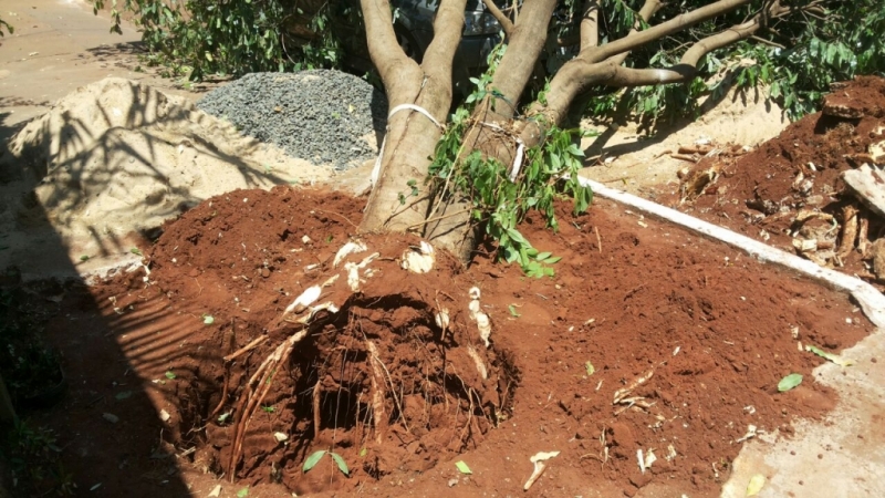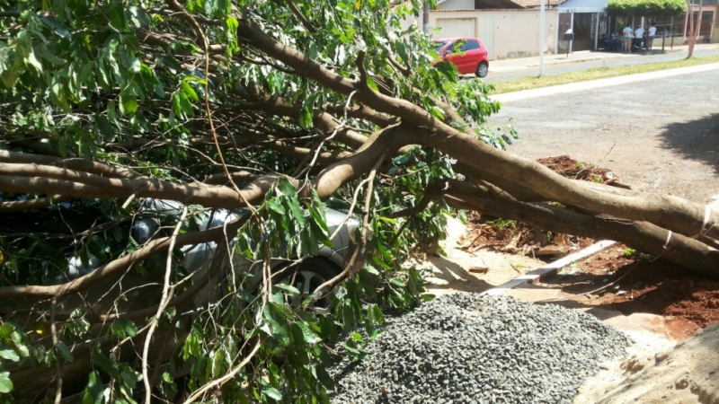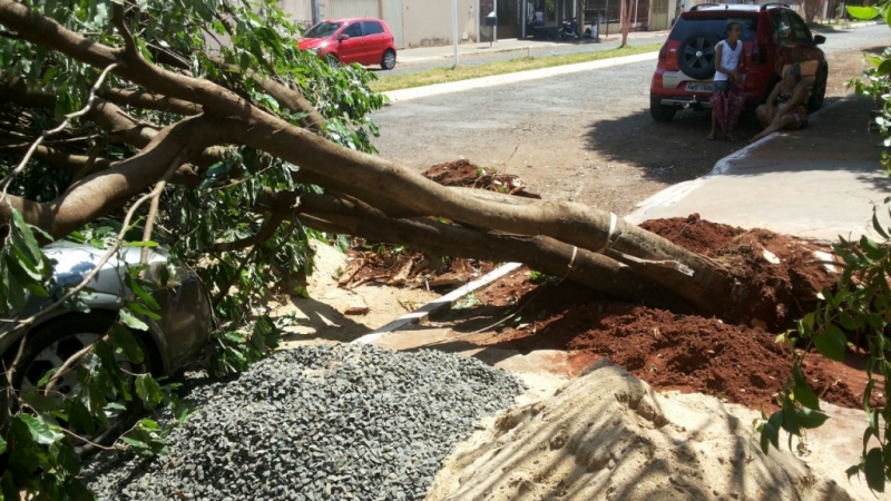 A árvore perdeu sustentação e caiu, quando estava sendo feita uma “coroa”, em torno da mesma. O veículo Astra que estava estacionado teve o para-brisas danificado, assim como avarias na lataria.