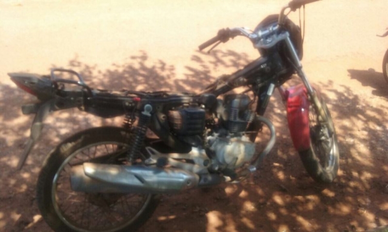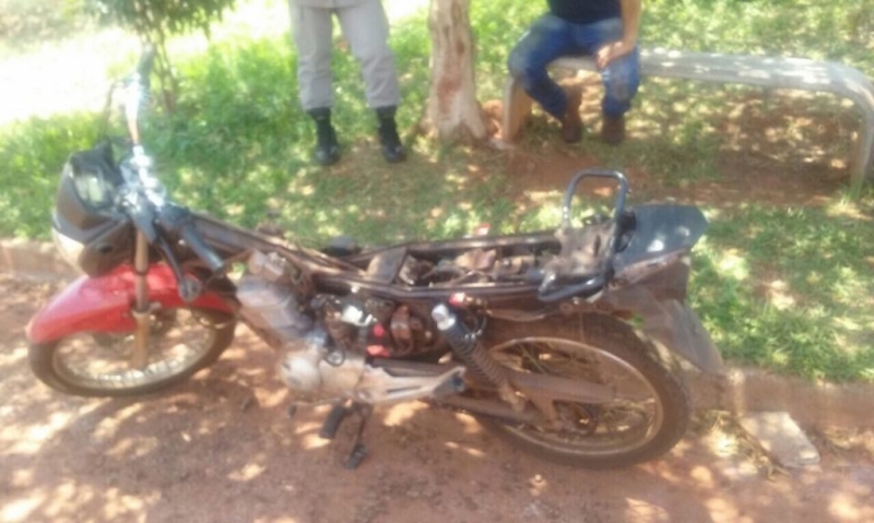 No local foi apreendida a motocicleta Honda CG 150 Fan, vermelha, ano 2014, placa QBF-7357, a qual havia sido roubada na noite do último domingo, próximo ao ginásio municipal de esportes, da vítima Eriwagner Alves. o veículo estava sem várias peças: tanque de combustível, banco, retrovisores, setas, bateria e outras, e foi levado para o pátio da 12ª CIPM.