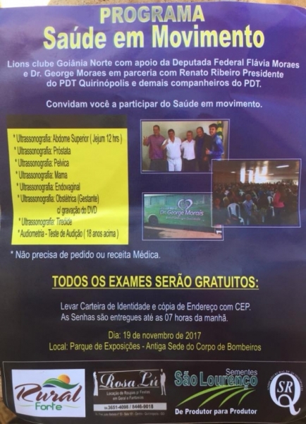 Dia 19 de novembro no parque de exposições – Antiga sede do corpo de bombeiros. Todos os exames serão gratuitos. Levar carteira de indenidade e cópia de endereço com CEP. As senhas serão entregues até as 7 horas da manhã. Exames: Ultrassonografias da mama.